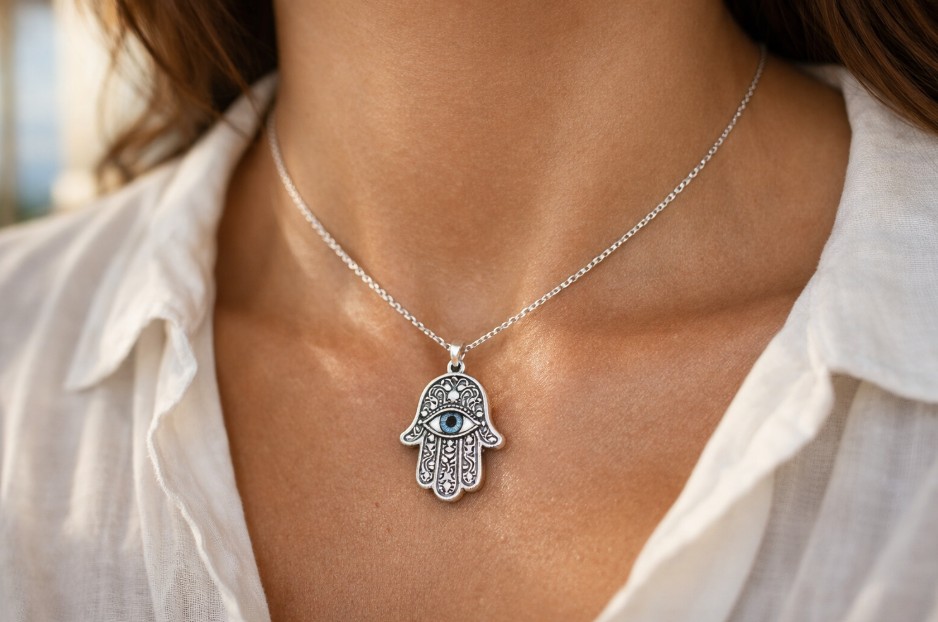 Dans sa version la plus connue, on retrouve souvent un œil au centre de la paume. Cet œil n’est pas seulement décoratif : il renforce visuellement l’idée de vigilance et de protection. C’est d’ailleurs cette combinaison entre la main et l’œil qui explique le succès durable du motif dans les bijoux, les objets de décoration et les amulettes.